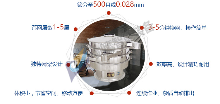 特點:任何顆粒、粉末、粘液一定范圍內(nèi)均可篩選。篩分細至500目或0.028mm, 過濾小可至5微米。分級篩選,可篩一至五層篩網(wǎng),能同時進行二至六個等級的分選或過濾。效率高、設(shè)計精巧耐用,換網(wǎng)容易、操作簡單、清洗方便。三元旋振篩雜質(zhì)、粗料自動排出,可以連續(xù)作業(yè)。獨特網(wǎng)架設(shè)計,篩網(wǎng)使用時間長久,換網(wǎng)快,只需3—5分鐘。體積小,節(jié)省空間,移動方便。